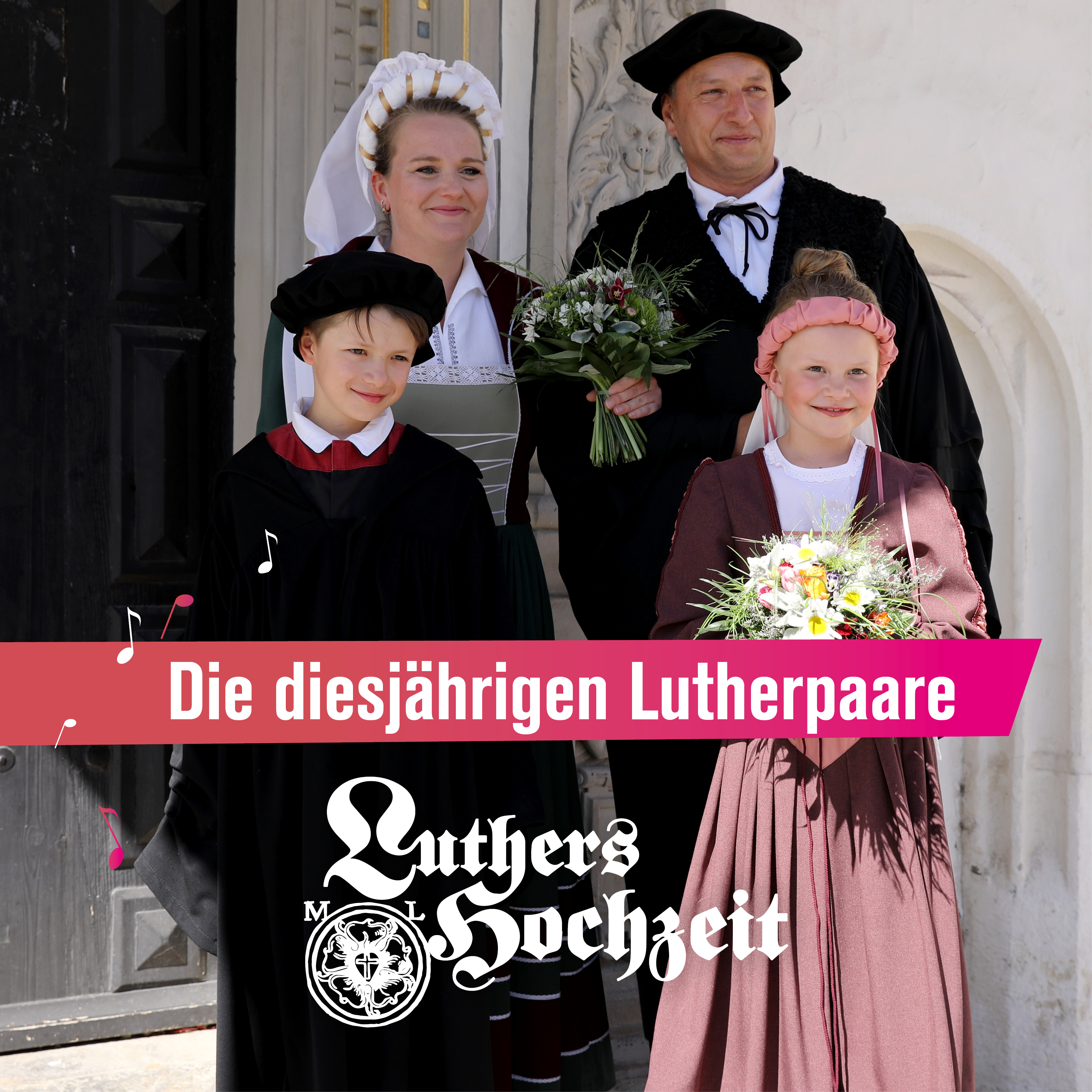 Die diesjährigen Lutherpaare sind Caroline und Oliver Koschmieder (sogar im echten Leben verheiratet) sowie Luise Böhmert (8 Jahre) und Karl Mattner (9 Jahre). Alle kommen diesmal aus Pratau.
